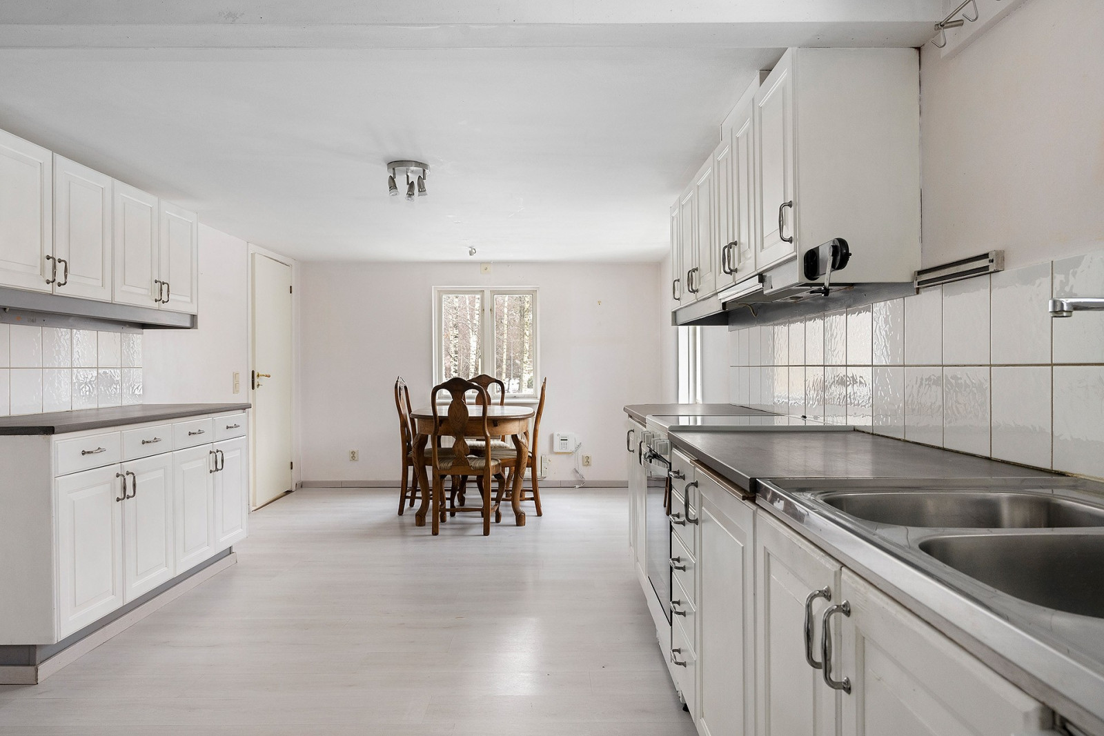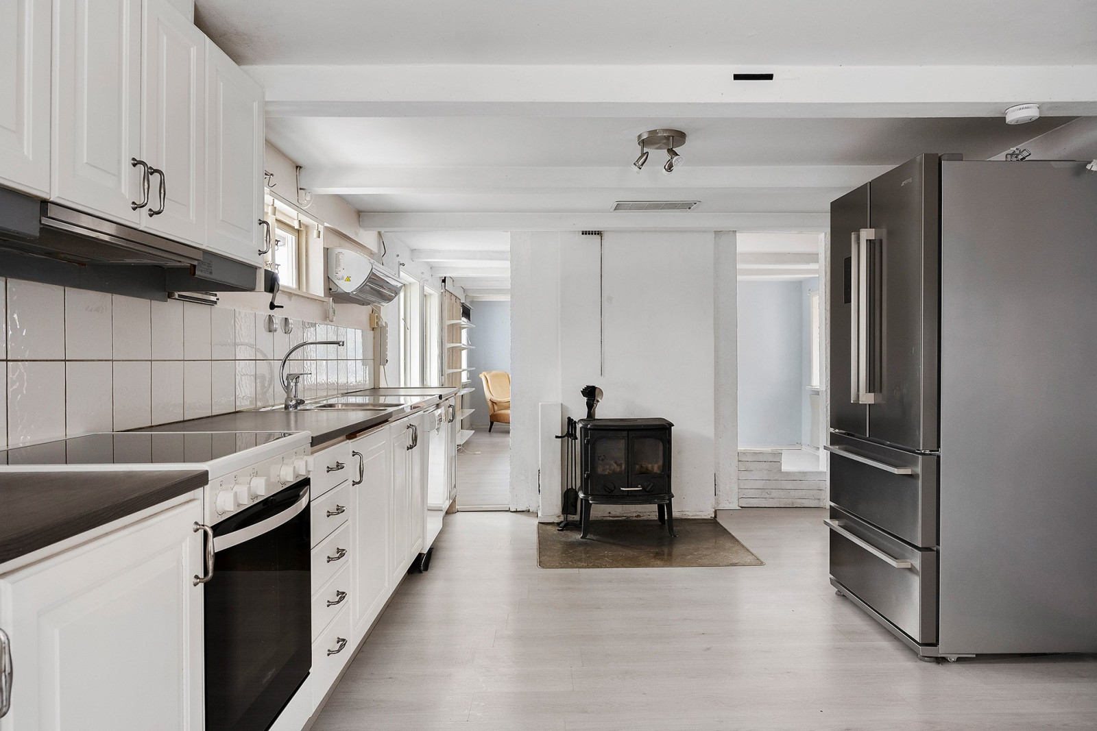 Luftigt kök med murstock som delar av köket mot allrummet. Köket har vitmålade köksluckor, synliga takbjälkar och en grå laminatskiva som bryter av. Köket är utrustat med spis/ugn, fläkt, diskmaskin, kyl med två draglådor (frys) av märket Smeg, kakel ovan köksbänk samt en värmande vedspis. I förlängningen av köket finns matplatsen med fönster åt norr och öster.