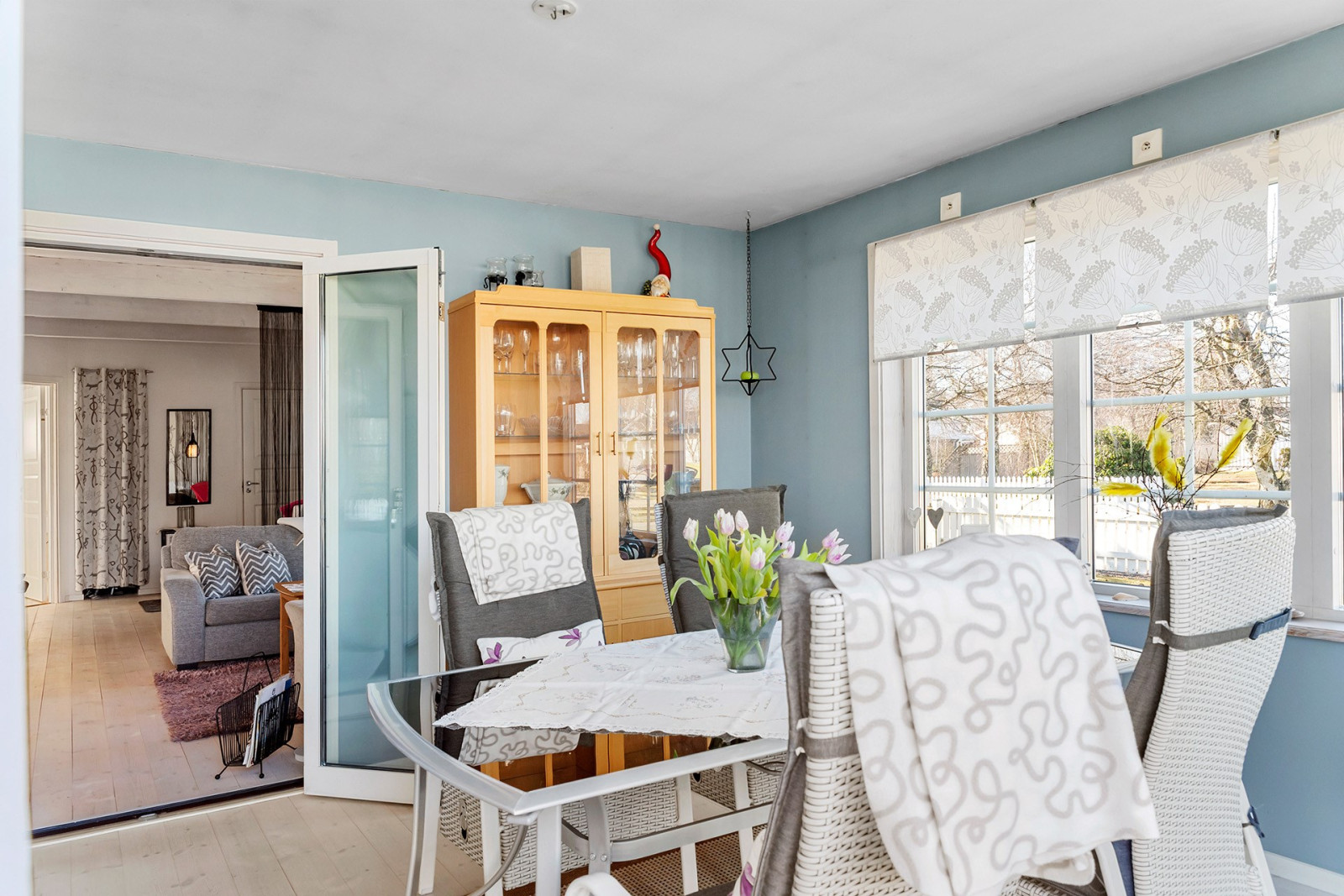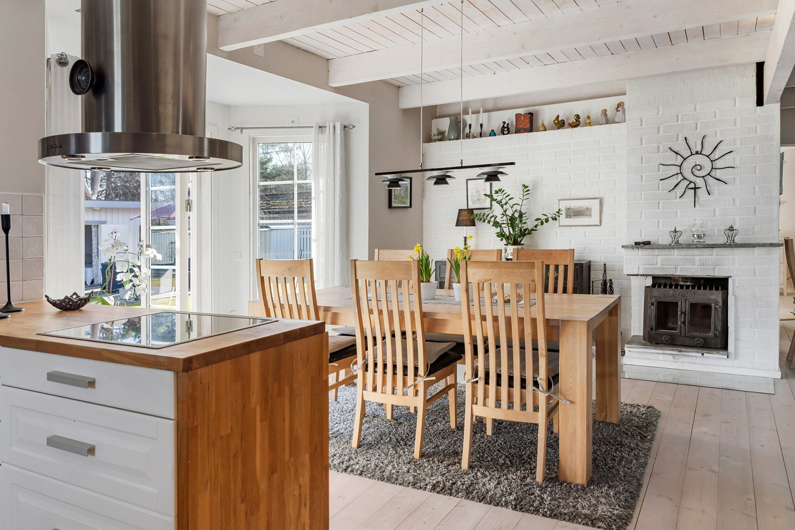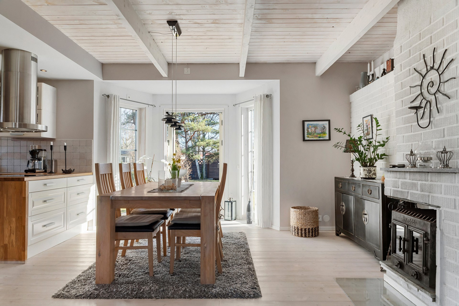 Entré sker via farstukvisten och välkomnar in till ett härligt allrum med vitpigmenterat trägolv och synliga takbjälkar som ger rummet en varm och karaktärsfull känsla. Här finns kamin samt gott om plats för både soffgrupp och matplats i det trevliga burspråket intill köket. Från allrummet nås det inglasade uterummet via pardörrar – en fin förlängning av bostaden som kan nyttjas stora delar av året.
