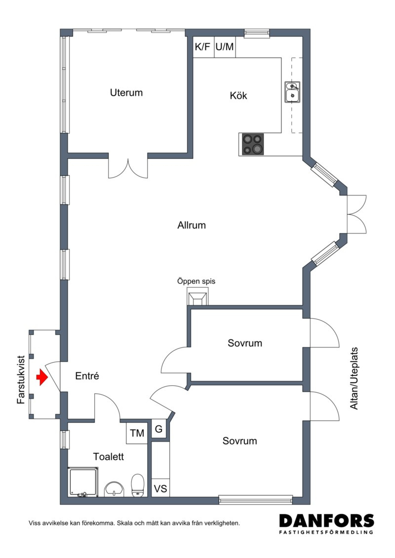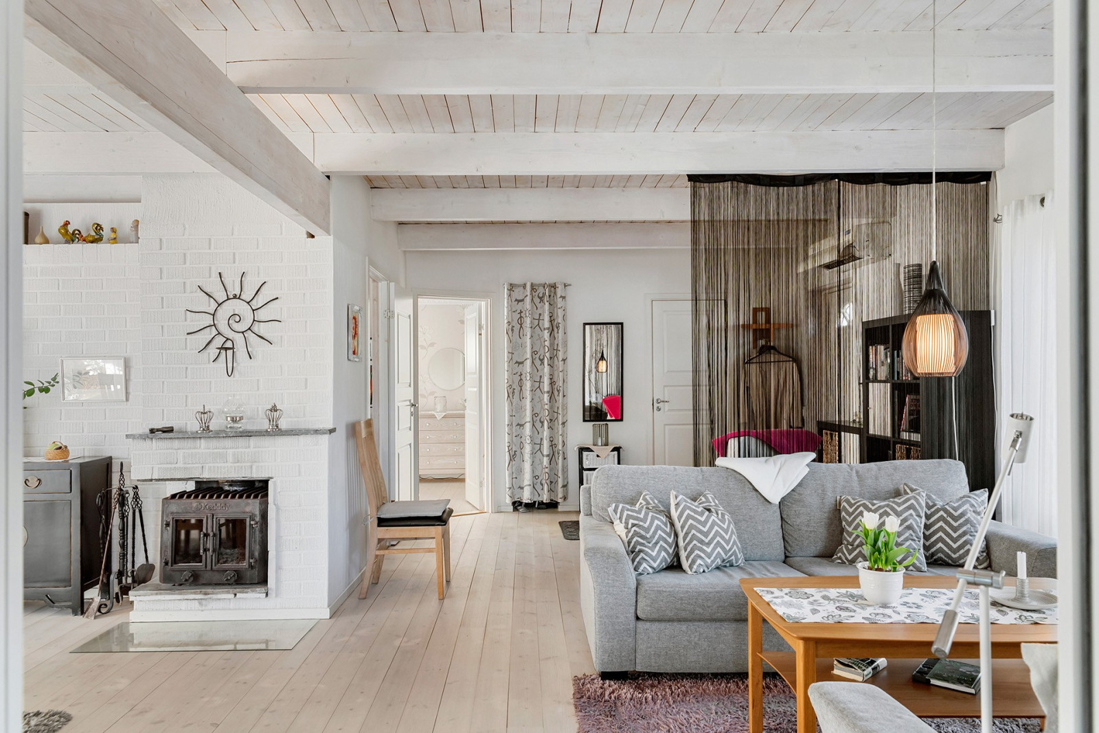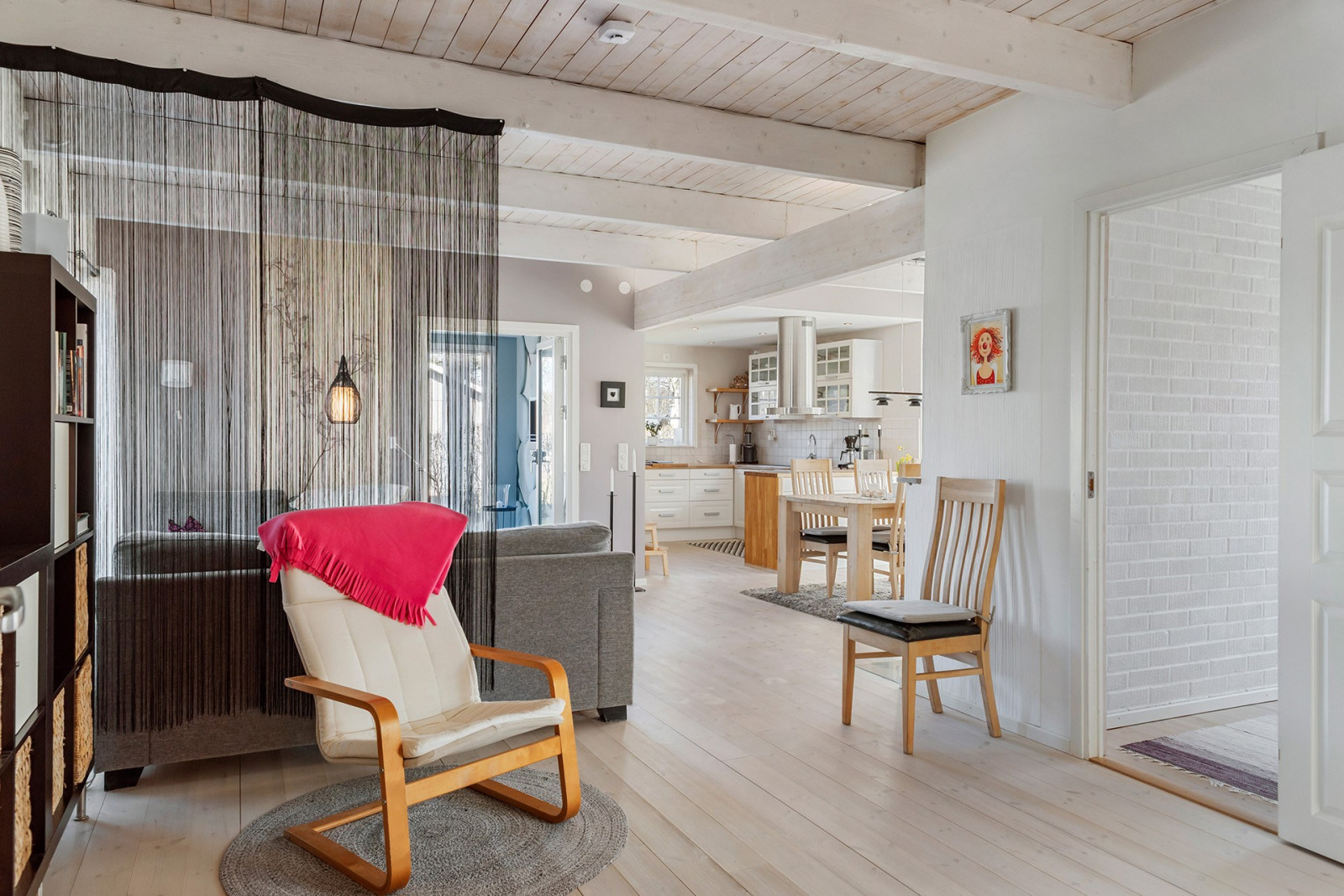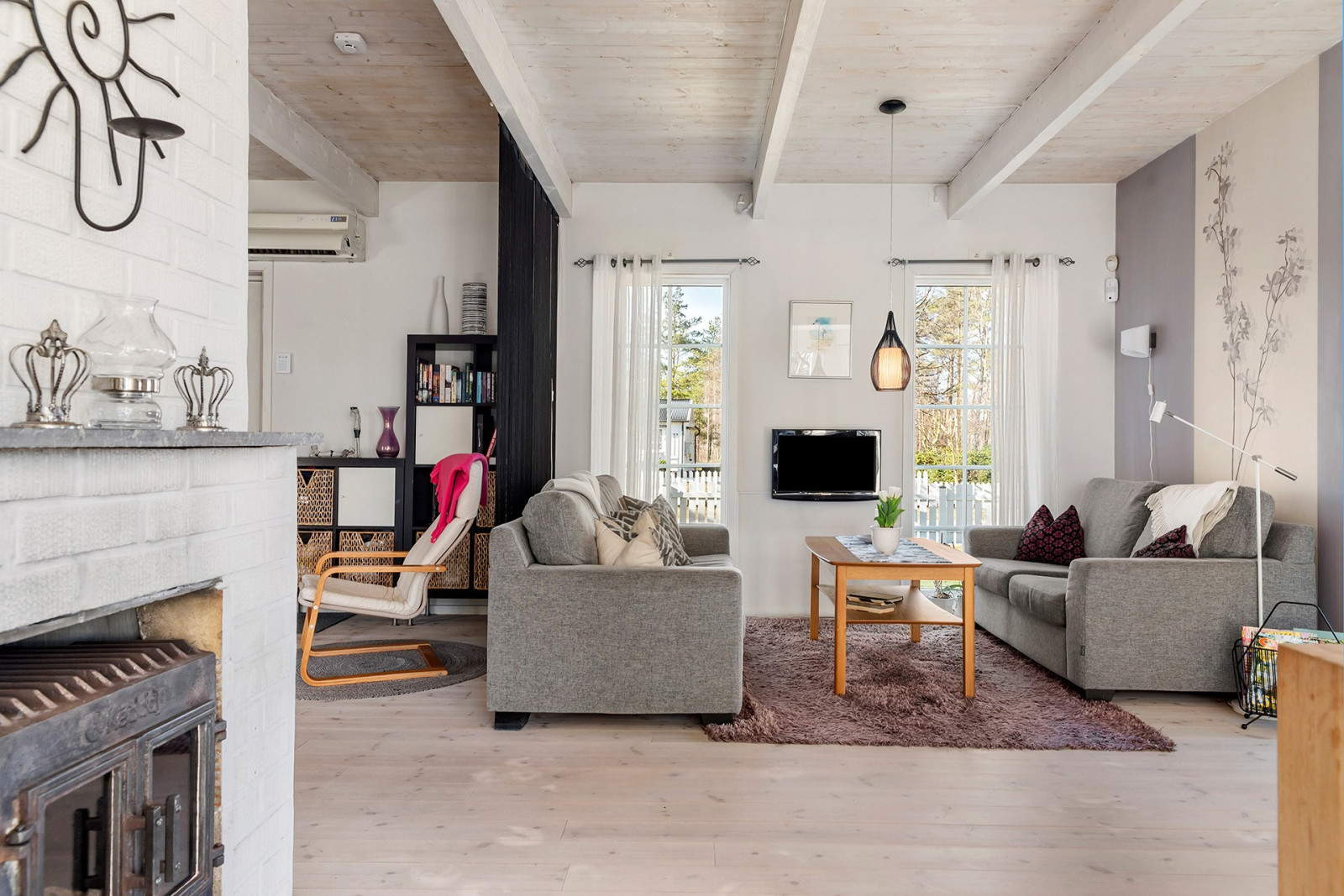 Entré sker via farstukvisten och välkomnar in till ett härligt allrum med vitpigmenterat trägolv och synliga takbjälkar som ger rummet en varm och karaktärsfull känsla. Här finns kamin samt gott om plats för både soffgrupp och matplats i det trevliga burspråket intill köket. Från allrummet nås det inglasade uterummet via pardörrar – en fin förlängning av bostaden som kan nyttjas stora delar av året.