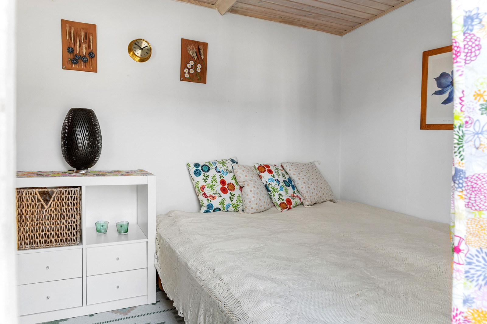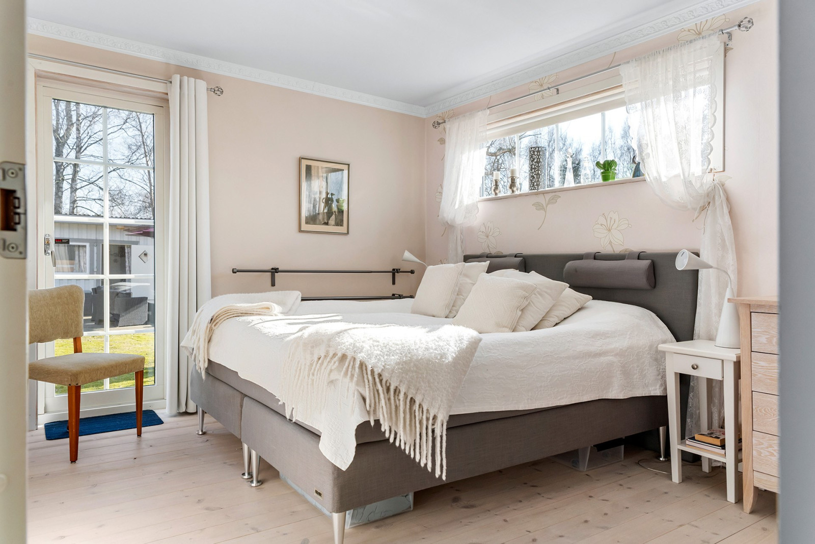 Trevlig sovrum med vit pigmenterat trägolv och ljusa färgtoner. Här finns skjutgarderob, liggande fönsterparti mot söder samt utgång till trädgården.