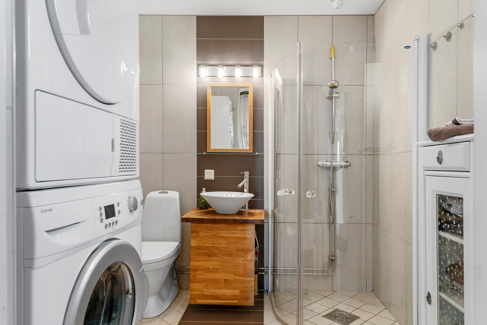 Inrett med klinker, kakel, tvättställ, dusch (vikdörrar glas), tvättmaskin, torktumlare, infälld takbelysning samt vädringsfönster.