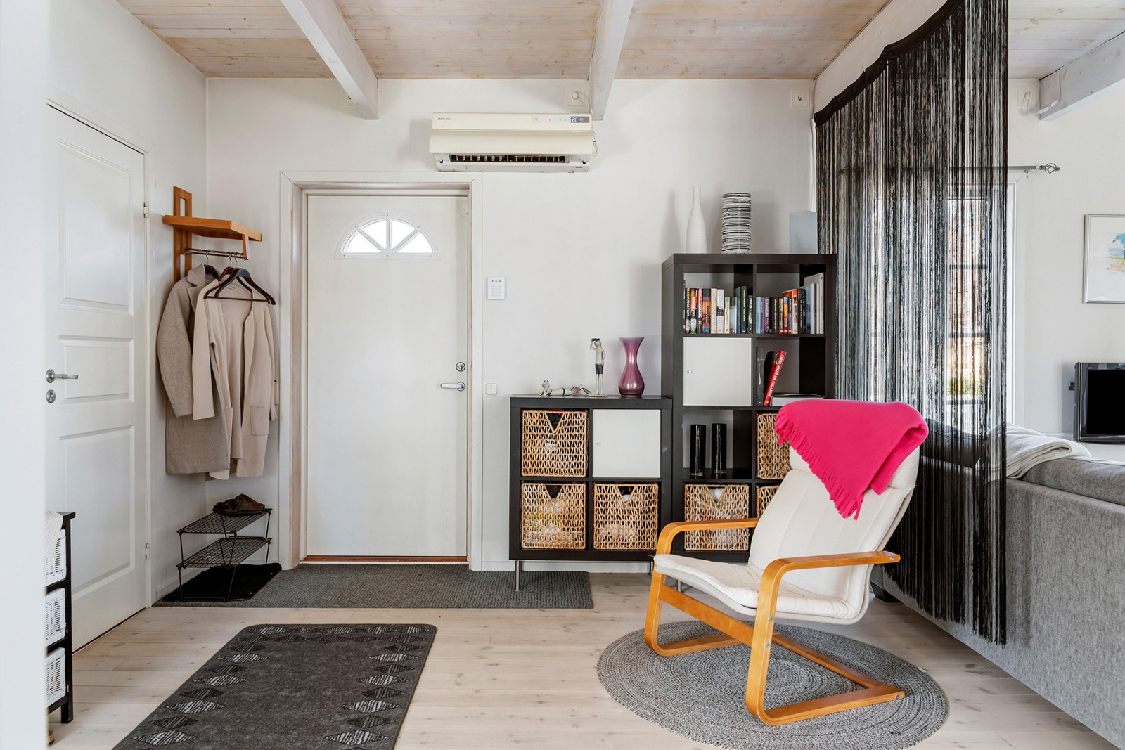 Rummet går i ljusa, harmoniska toner och har en öppen och social planlösning mot köket som ligger i direkt anslutning. Till höger från entrén finns badrummet, praktiskt utrustat med både tvättmaskin och torktumlare. Bostaden erbjuder två sovrum, båda med utgång via altandörr till trädgården. Det större sovrummet har dessutom goda förvaringsmöjligheter med skjutgarderob.Entré/allrum