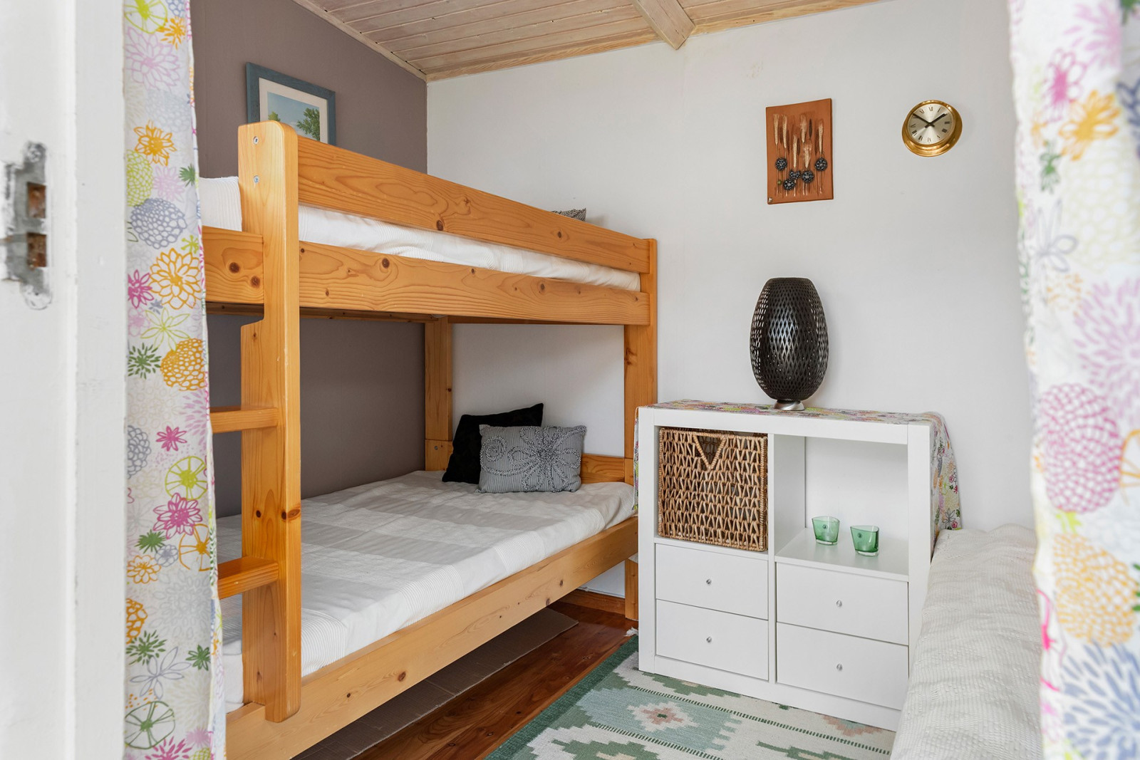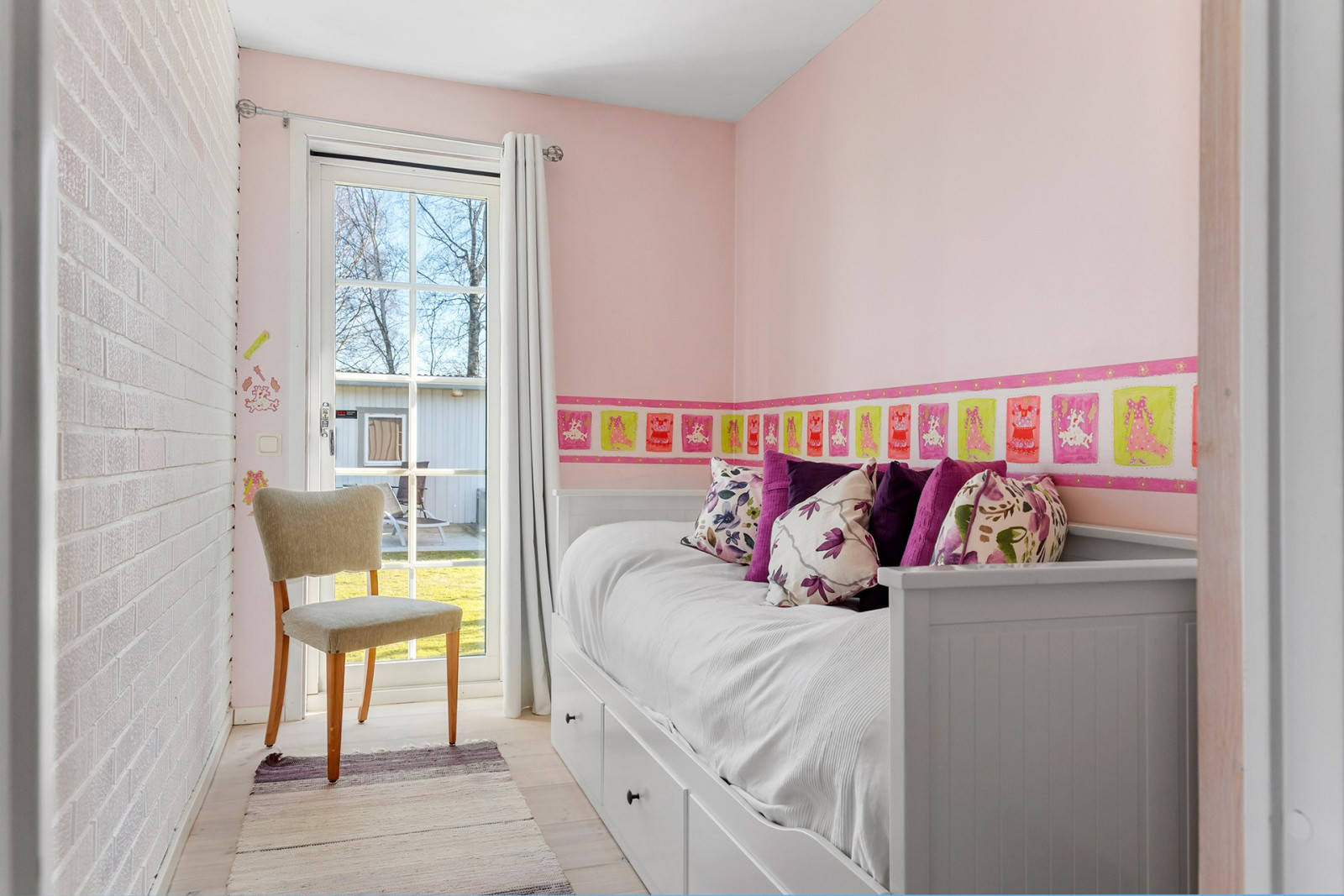 Litet mindre sovrum med vit pigmenterat trägolv och altandörr ut mot trädgården.