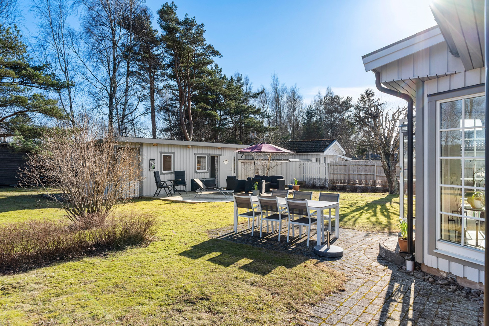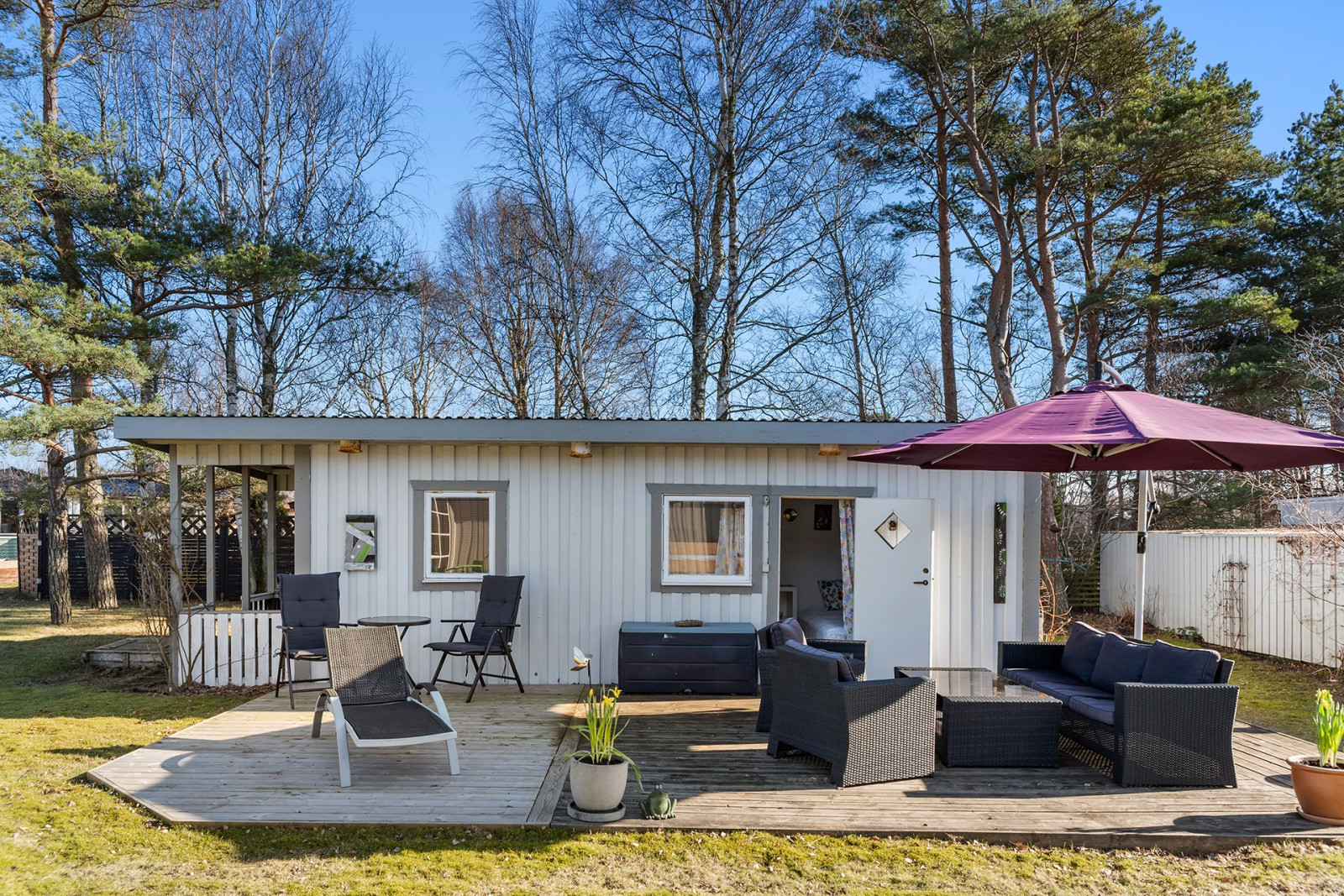 För extra gäster finns denna fristående stuga där ena delen är inrett till gäststuga och den andra till förråd.