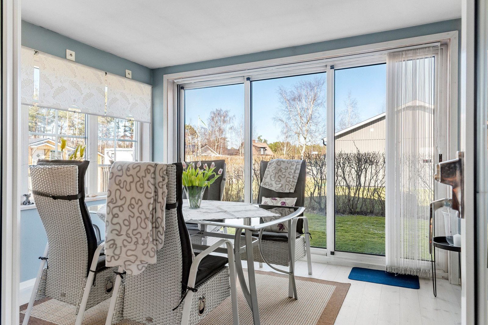 Inglasade uterummet angränsar till allrummet och är inrett med vit pigmenterat trägolv, skjutpartier mot trädgården samt fasta fönsterpartier mot Kolonivägen.