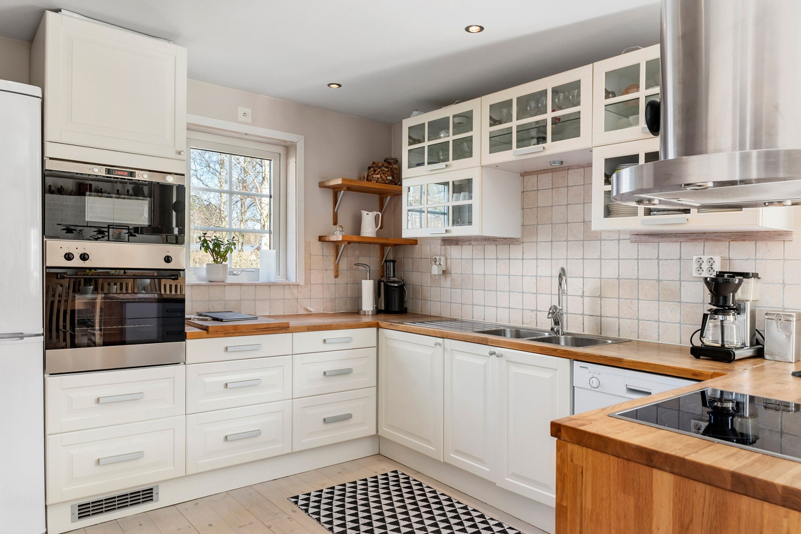Trevligt kök från Ikea med bänkskivor av massiv ek, vita köksluckor, vitrinskåp ovan köksbänk samt vit pigmenterat trägolv. Utrustat med spishäll (induktion), fläktkåpa, diskmaskin, kombinerad kyl/frys, integrerad ugn och mikro och infälld takbelysning.