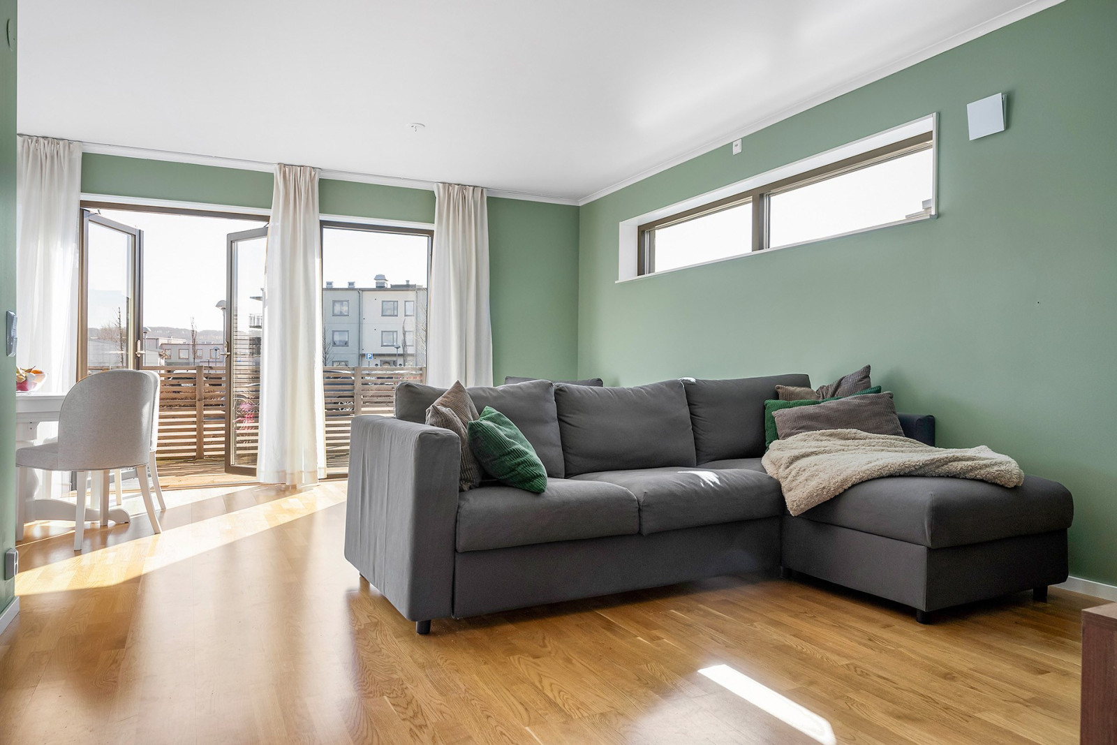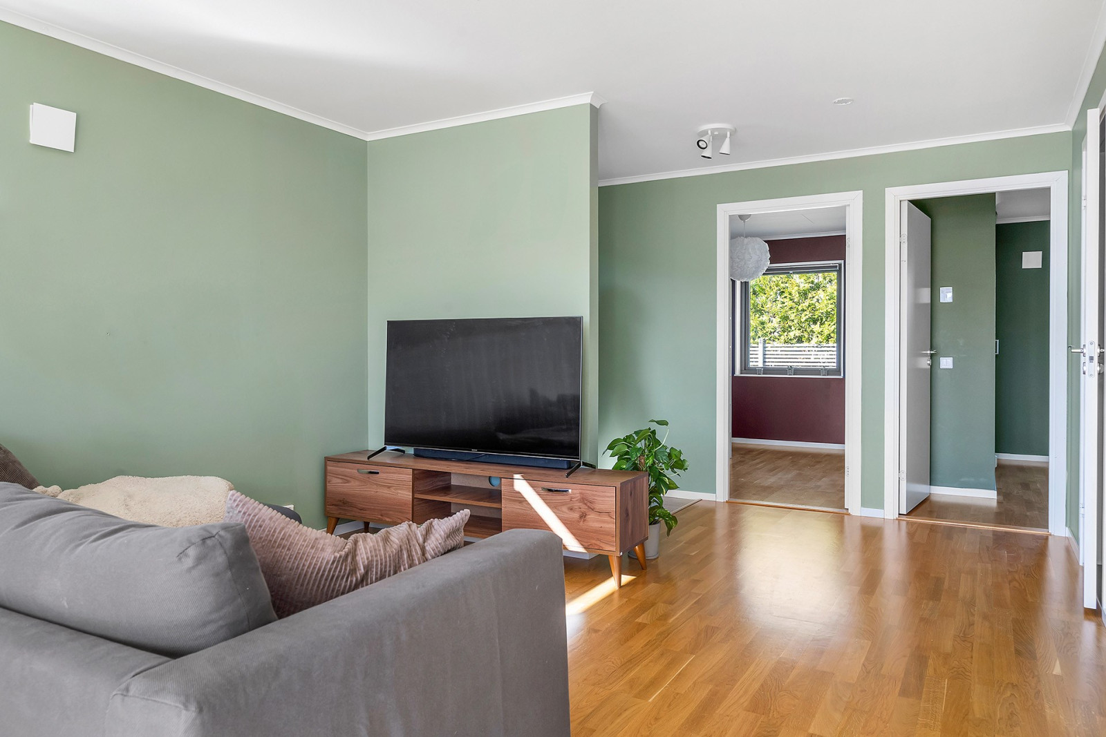 Entré till en klinkerbelagd hall. Vidare in i lägenheten finns åt höger ett sällskapsrum med öppen planlösning mot köket samt utgång via dubbeldörrar till ett rymligt altandäck i söderläge. Ljus flödar in ifrån de generösa dubbeldörrarna och skapar en luftig känsla i hela rummet. På vänster sida om hallen finns de två sovrummen med garderobsförvaring. Rakt fram från hallen finns badrummet placerat. I badrummet finns dusch, WC, handfat samt tvättmaskin och torktumlare. Intill badrummet finns också en praktisk klädkammare.Kök