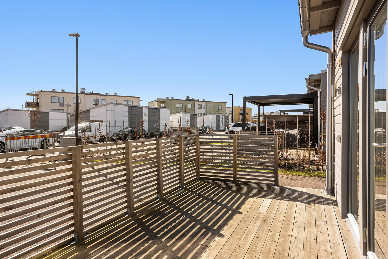Härligt tralldäck åt söder som nås via glasdörrar från sällskapsrummet och matplatsen.Bilplats