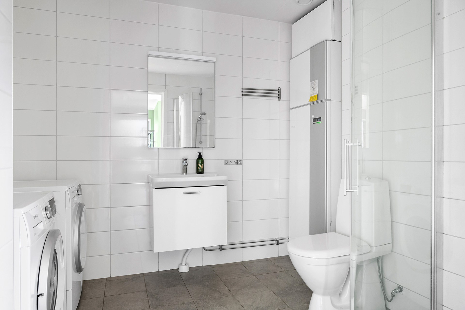 Helkaklat badrum med dusch, WC, handfat samt tvättmaskin och torktumlare.